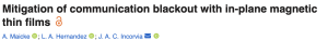 The communications blackout problem encountered by objects rapidly traveling in atmosphere can be mitigated via the application of magnetic fields. Traditional (electro-)magnets used to generate strong out-of-plane fields to magnetize plasma sheaths can be large and heavy, limiting the benefits of the approach. This article investigates the potential use of magnetic material sheets magnetized in-plane to reduce material size requirements and make use of the material’s natural shape anisotropy. Via frequency bandwidth analysis, the existence of open communication bands due to applied in-plane magnetic fields is revealed. Numerical solvers are formulated to compute (i) the varying fields applied in 3D space from source magnetization regions and (ii) signal attenuation through magnetized plasmas. Performing three numerical studies, it is found that the sizes and locations (in frequency space) of opened windows depend on the plasma profile, the transmitter location, and the material shape, and the magnetic configurations, which offer the greatest reduction in signal attenuation, can often be unintuitive. In addition, it is shown that it is possible to use arrays of smaller magnetic elements to emulate the performance of bulk material, enabling the use of modern thin-film magnetic materials. The presented analysis and numerical studies show that thin-film magnets are expected to be able to open windows to overcome communication blackout.